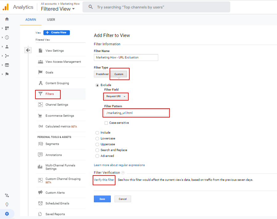 - Click “Verify this filter”. (If you don’t have enough data to verify, it is going to give you an error. You can just continue without verifying it if you are confident that the URL that you have typed is correct.)