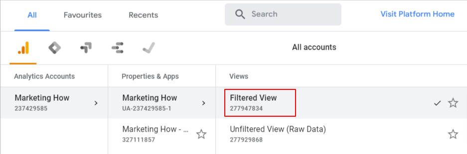 - Enter your Google Analytics Account > UA Property > Filtered View. (If you don’t have any Filtered Views yet, it is advised that you should open a view next to your Unfiltered View containing raw data of your website.)