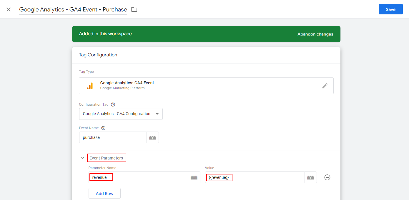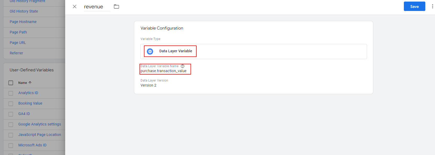 - Now you need to determine which parameter you want to track. You need to set a valid value for this parameter. You can go to the “Variables” section to use & create built-in variables on Google Tag Manager or create a brand new one with your advanced coding & GTM skills. For example, if you want to track “revenue”, the value of this parameter is not reachable directly from GTM. We will need to send the revenue data to dataLayer. After we’ve sent the data to the dataLayer, we just need to define a Data Layer Variable and fetch the value from the dataLayer To exemplify, if the revenue value is sitting under the “purchase” object’s “transaction_value” key, we will type “purchase.transaction_value” to bring it to the GTM.