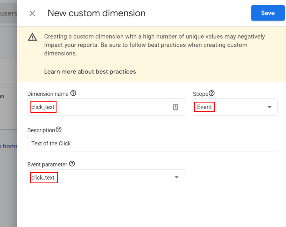 - Set “Dimension name”, “Scope” and “Event Parameter”. If the event is connected to the user, you can set its scope as “User”, i.e the Scope of the parameters like “user_id”, “user_cookie” must be User. Then type the event parameter that you’ve added as a field into your GA4 Event, for this instance it is going to be “click_text”.