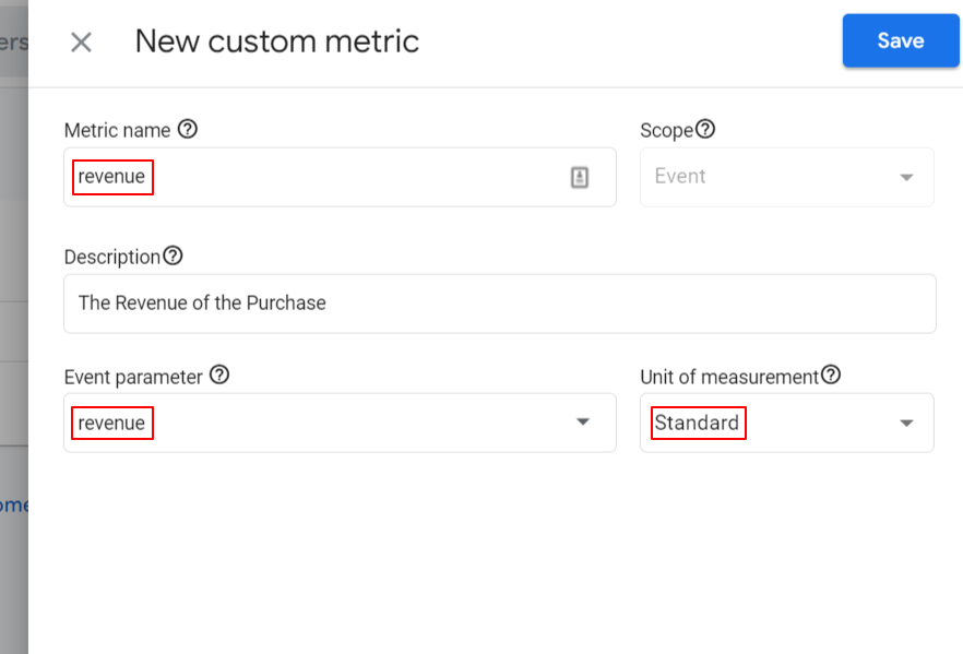- Set “Metric name”, “Event Parameter” and “Unit of measurement”. There are plenty of Units of measurement types such as currency, miles, and seconds. Then type the event parameter that you’ve added as a field into your GA4 Event, for this instance it is going to be “revenue”.