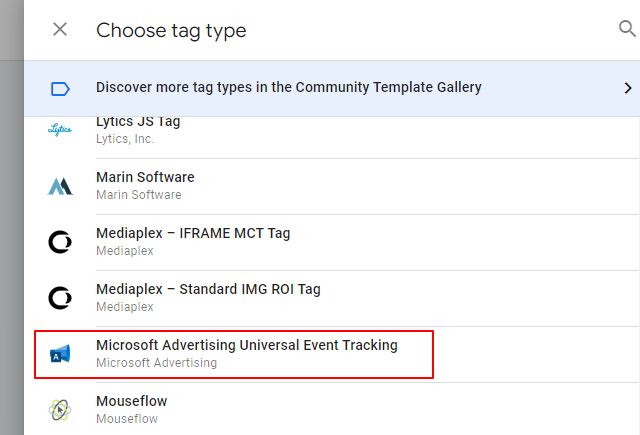 - Again, add a new tag and select “Microsoft Advertising Universal Event Tracking” from the right-hand nav.