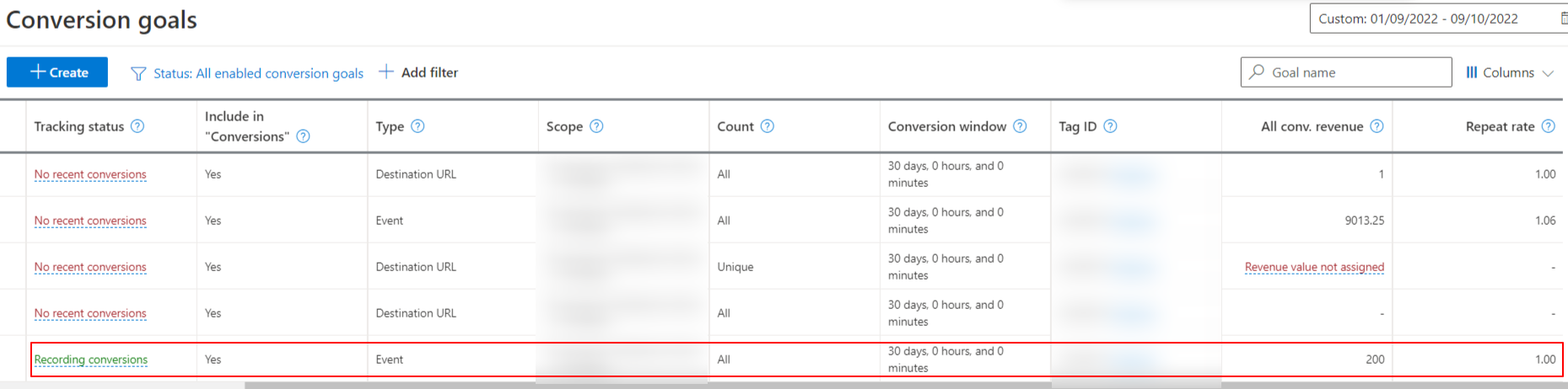 - The final step for Microsoft Ads is that, after we publish the GTM code, we need to make sure our tracking is working correctly. Thus, we need to see some conversions under “Conversion Goals” page in the following days. If the tracking status is “Recording conversions” and “All conv. revenue” & “Repeat rate” is not empty, we can say that our Microsoft Ads – Conversion Tracking setup is completed.